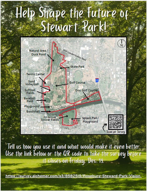 “Stewart Park is part of what makes Roseburg special,” said Ligon. “We’re collecting ideas to shape its next chapter. Please take the survey and tell us what matters most to you.”