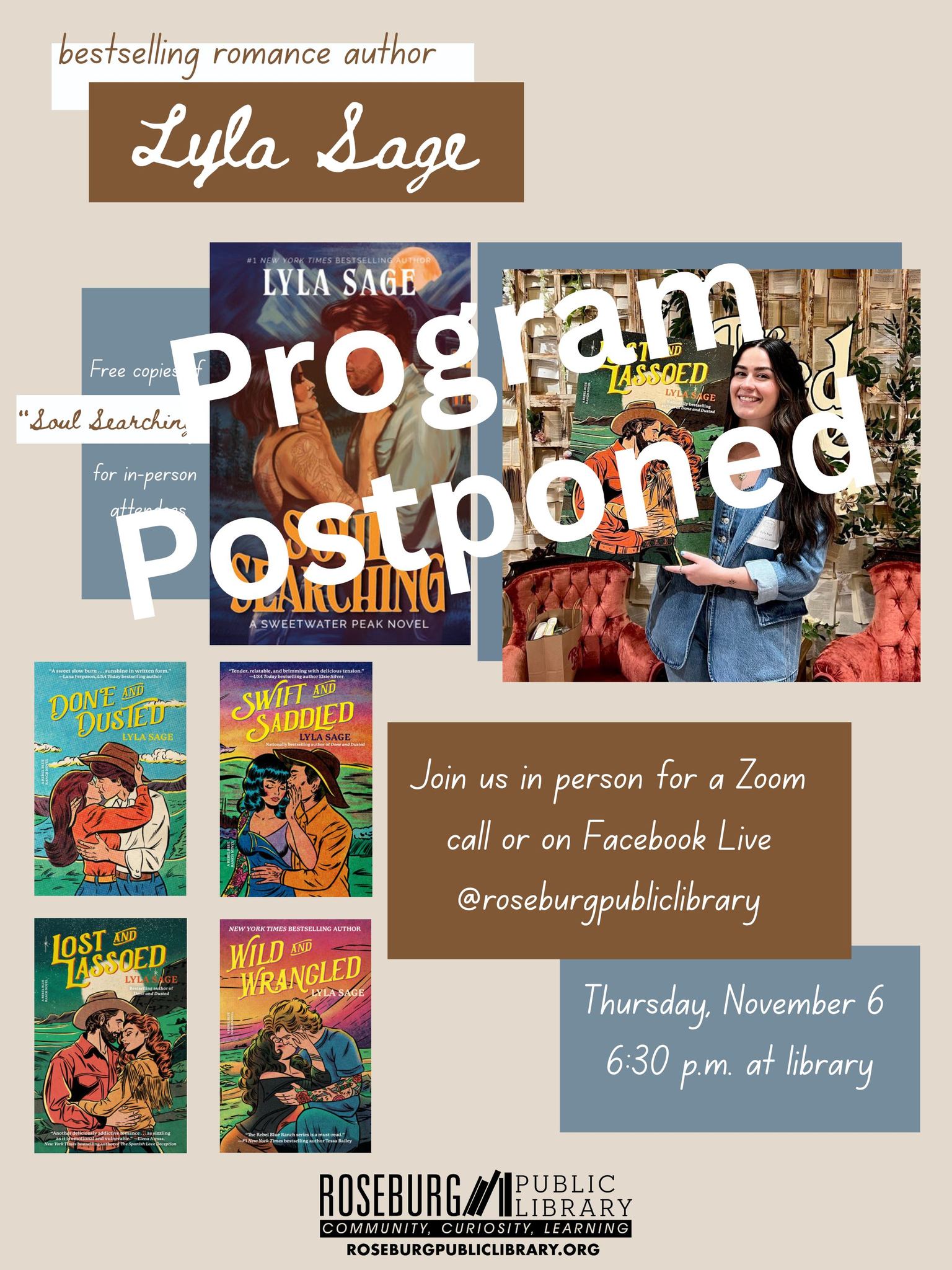 ROSEBURG, Ore. – Roseburg Public Library’s event with author Lyla Sage, scheduled for 6:30 p.m. today, has been postponed.